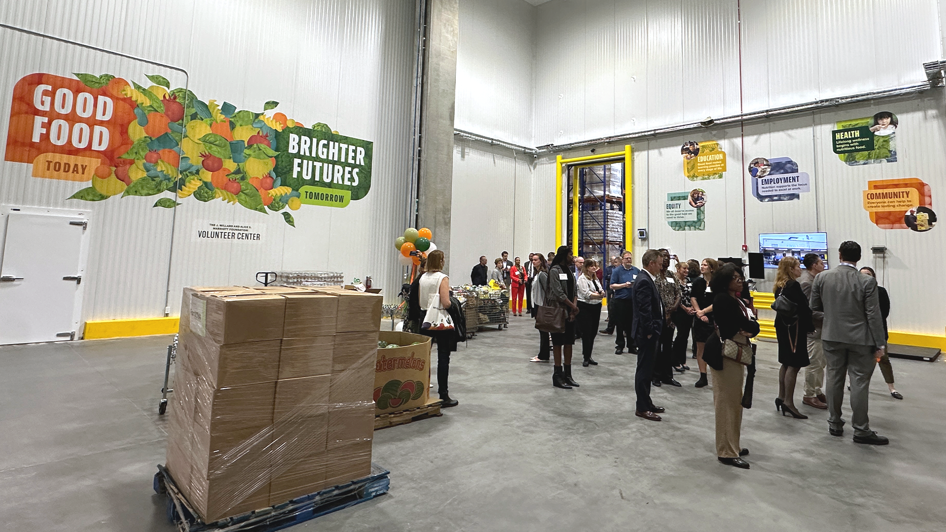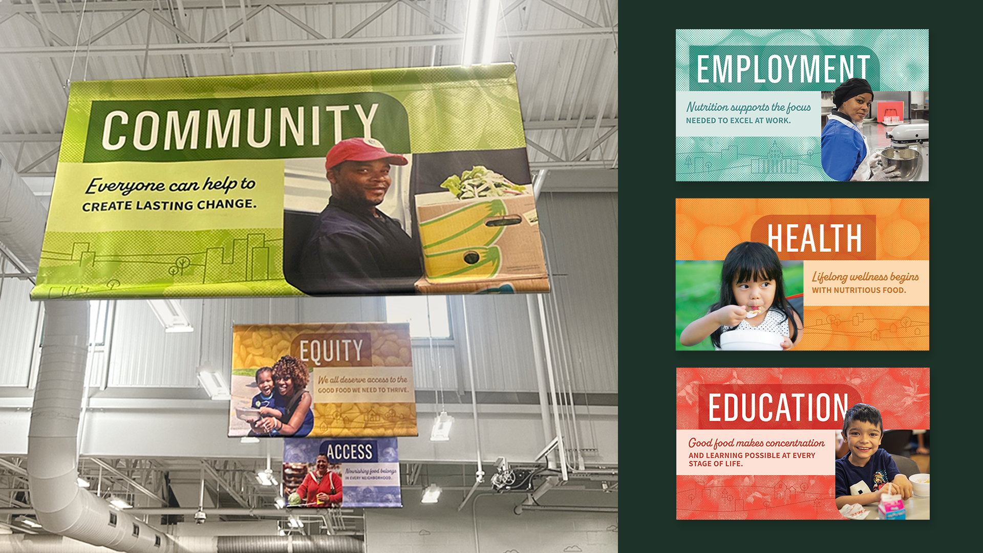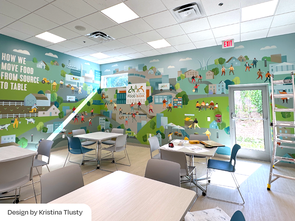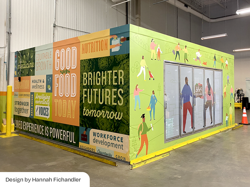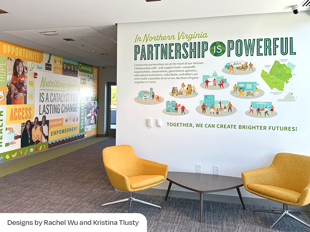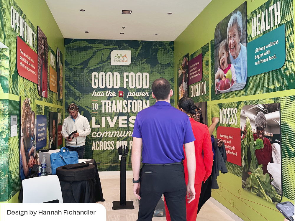Our team at Eighty2Degrees partnered with the Capital Area Food Bank (CAFB) to bring its mission to life through large-scale environmental graphics across two major facilities. At the Washington, DC headquarters, we transformed the Agency Mart warehouse into an inspiring multi-purpose space. I contributed to the design of a 3D perspective mural of CAFB’s delivery truck, developed a series of hanging banners that share impact statements, and supported graphics across additional zones. After the success of this project, CAFB invited us to create visuals for its new 43,000-square-foot distribution facility in Lorton, Virginia. Completed in 2024, the space features bold storytelling across many interior areas. I led the design for the lobby, warehouse graphics, and garage doors, and supported the broader visual system. Together, these projects channel CAFB’s brand into dynamic environments that motivate volunteers, donors, and staff to fight hunger every day.