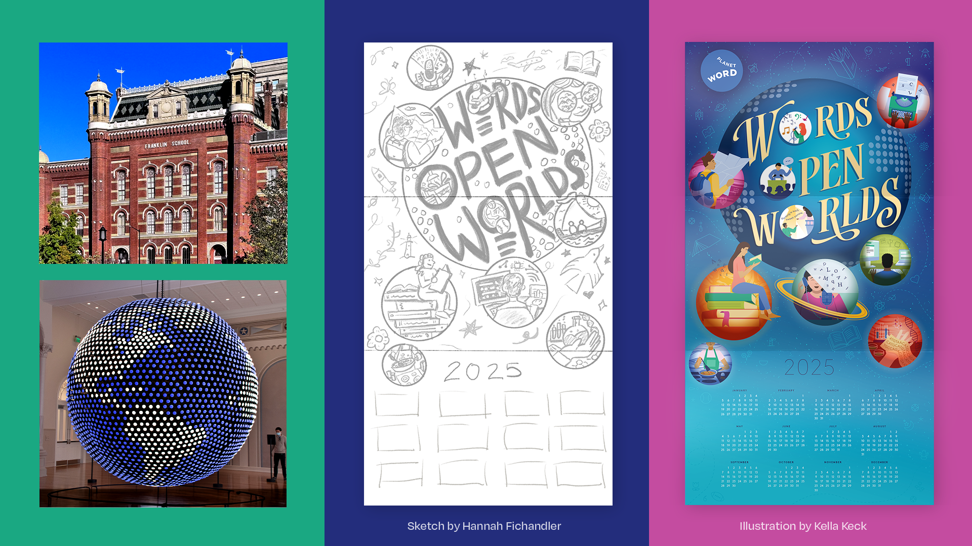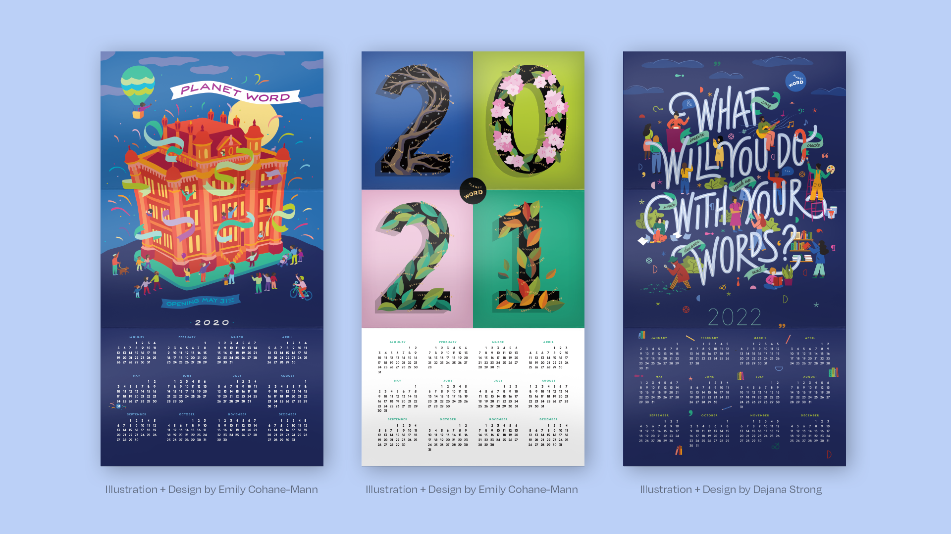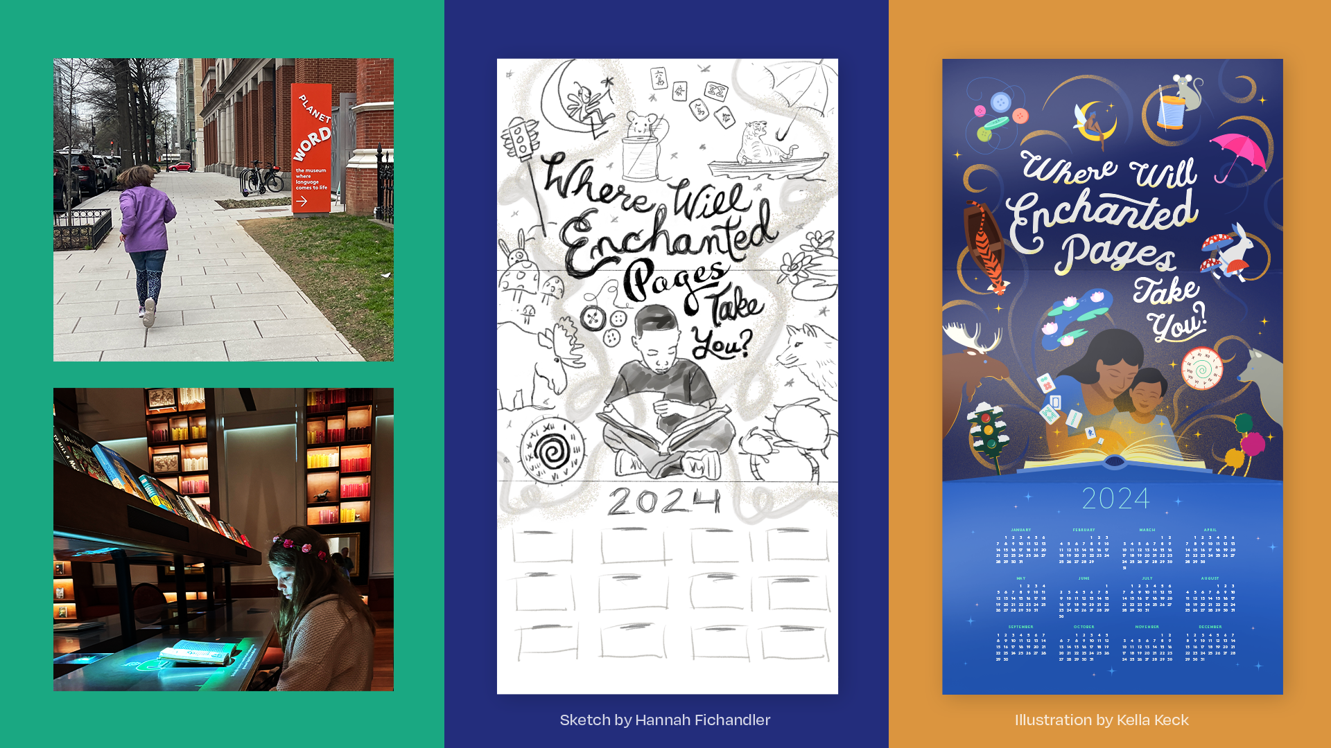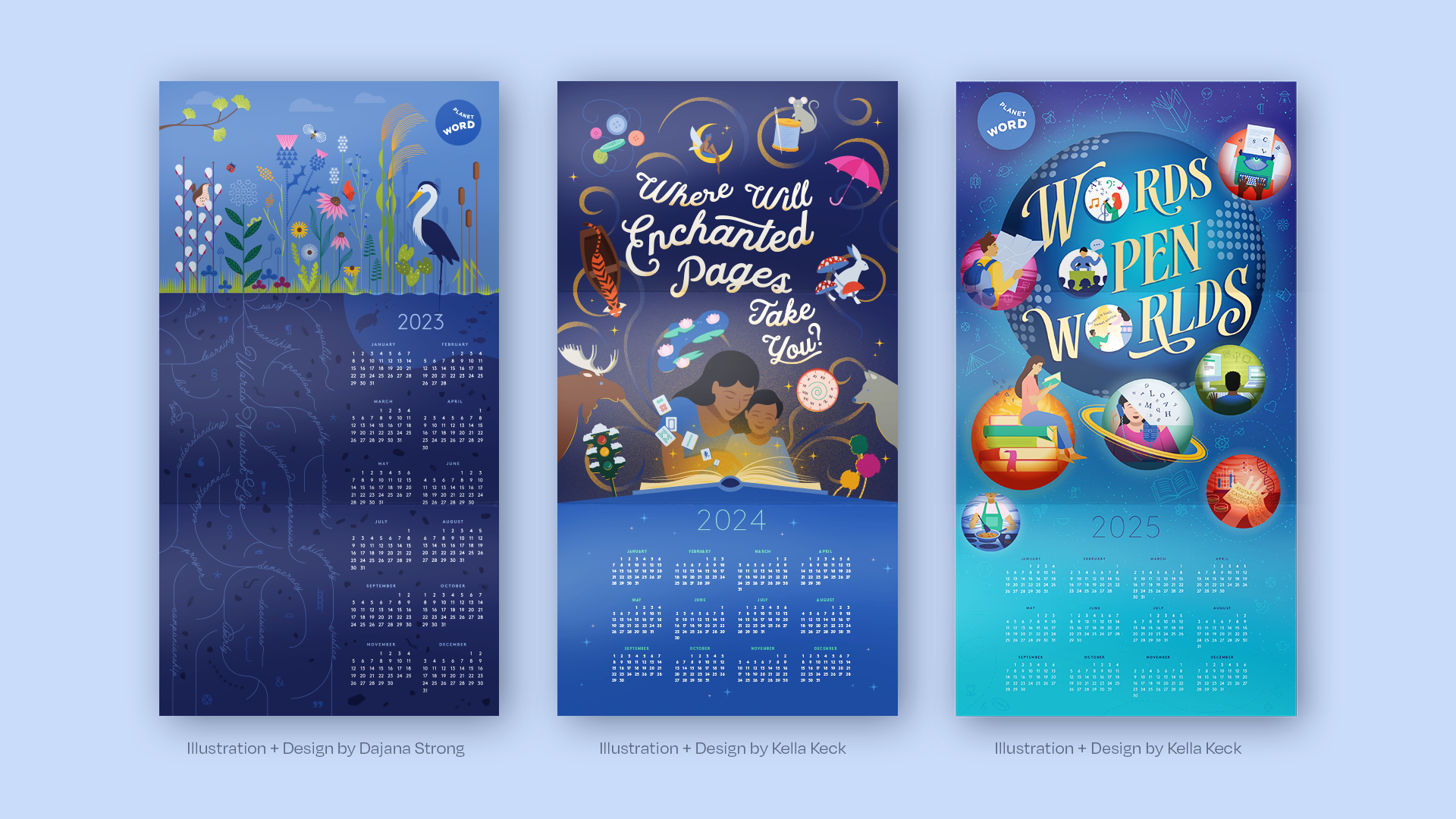Our team at Eighty2Degrees has partnered with Planet Word for several years to design their end-of-year mailers. Each one thanks supporters, celebrates the joy of language, and includes a surprise calendar as a small gift. The calendar features a conceptual illustration tied to the museum’s mission and evolving themes. For the 2024 and 2025 editions, I created the illustrations based on sketches by Hannah Fichandler. We explored ideas like the magic of books and the power of storytelling. With bold visuals and playful details, we aimed to create a piece that sparks delight—and earns a spot on the wall all year long.